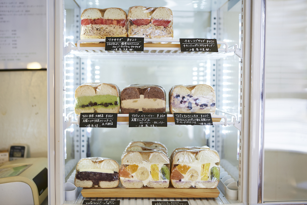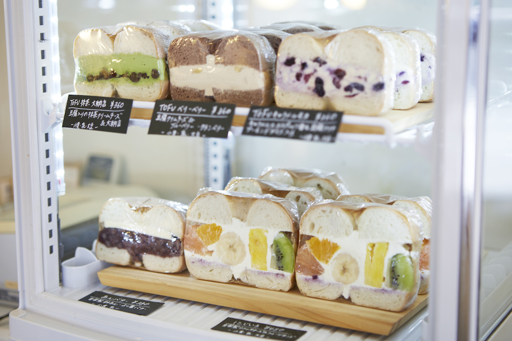 左から、木綿豆腐とクリームチーズを使った自家製クリームをベースに、抹茶をブレンドしたクリームと大納言をサンドした「TOFU抹茶大納言」(360円)、ブルーベリーとクランベリーを混ぜてサンドした「TOFUベリーベリー」(360円)、キャラメルとエスプレッソの香るクリームに、アーモンドダイスをちりばめた「TOFUキャラメルモカ」(360円)。どれもあっさりとした甘みで、2個はペロリ!