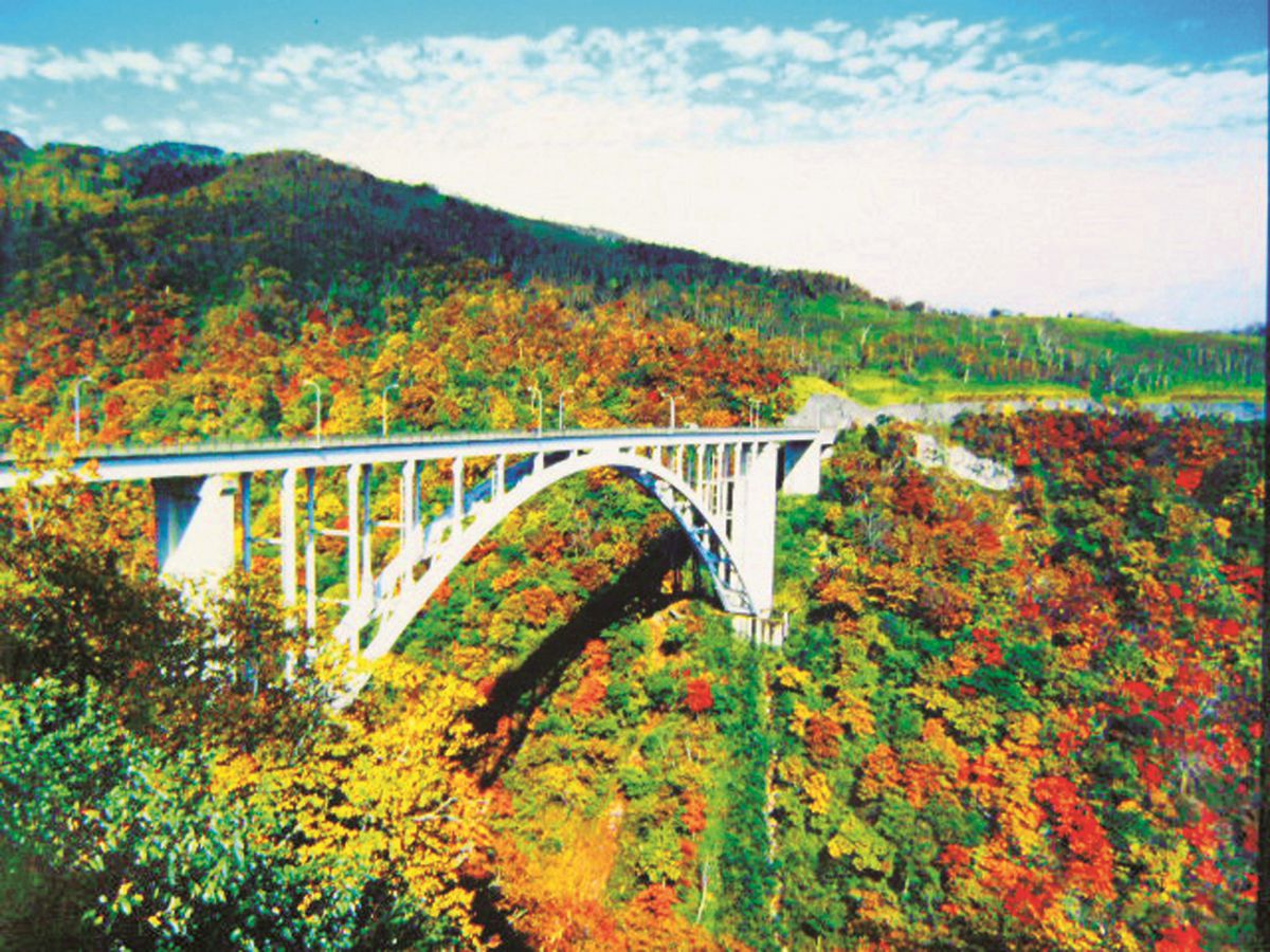 六方沢橋は道路面とアーチ部分が支え合う、全長320mの逆ローセ形アーチ橋。谷底からの高さは約134mあり、橋の上からは広大な関東平野が見渡せます。
