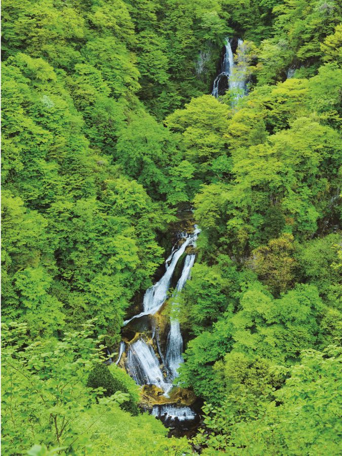 原生林の間を流れる滝の優美さにうっとり