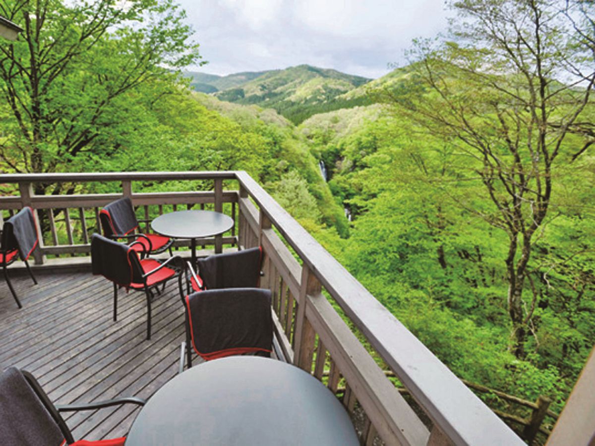霧降ノ滝のすぐそばに立つ、恵まれた立地の山のレストラン。テラス席からは滝を見下ろすことができます!