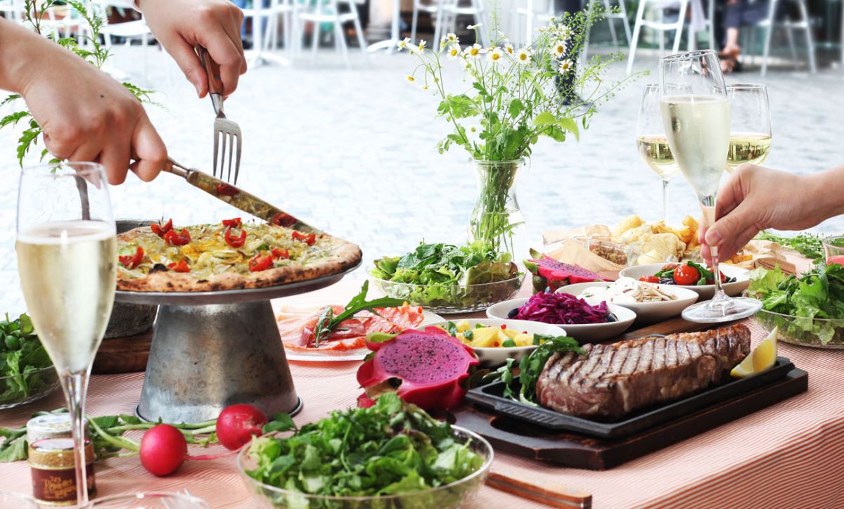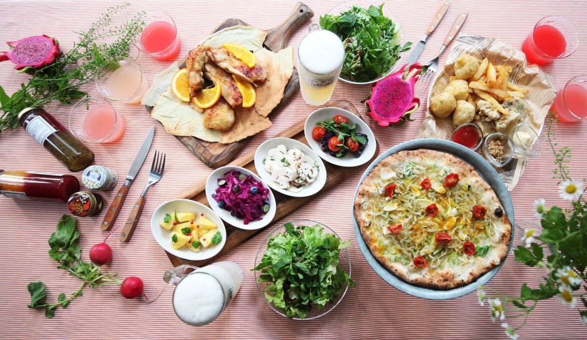 飲み放題つきビアガーデンプランは全5プラン。美容にうれしい夏野菜や、フルーツとハーブを組み合わせた色鮮やかな前菜、揚げたてのフィッシュ&チップス、からすみを使った贅沢ピッツァやメインディッシュまで充実したラインアップ。