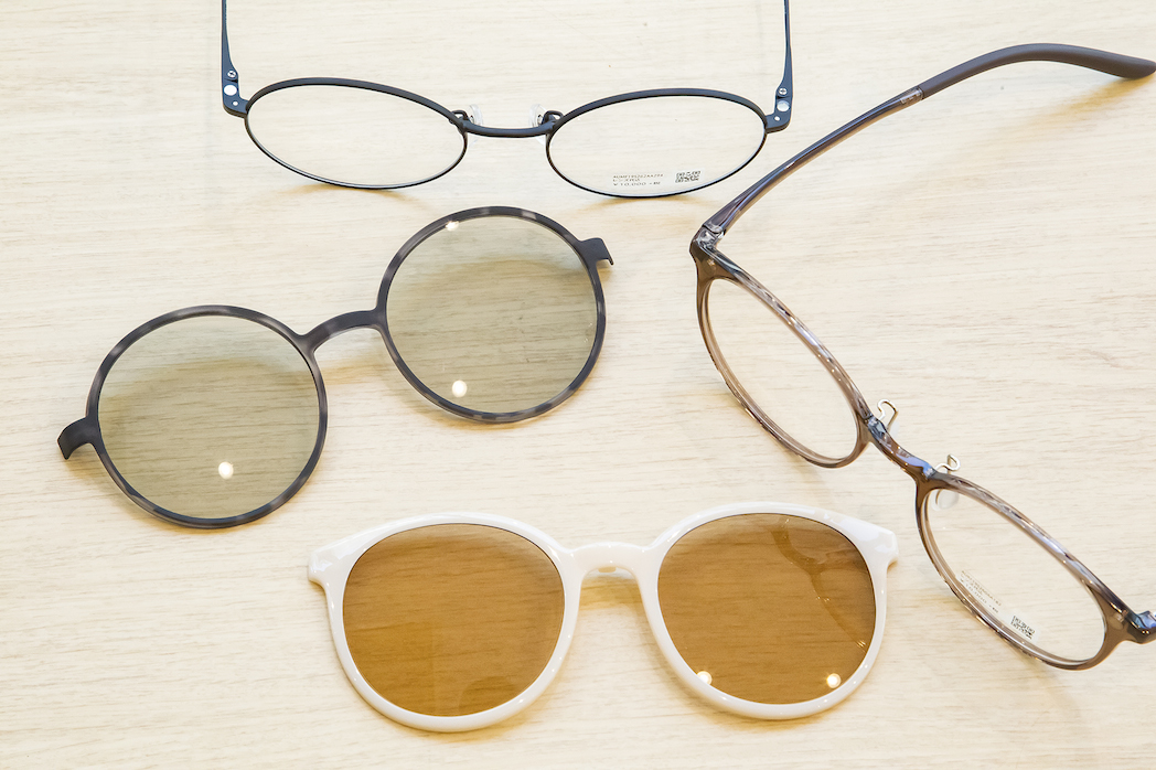 さらに、画期的なのが「JINS Switch」という商品。度付き眼鏡の上に専用のプレートを重ねるとサングラスに早変わり。フレーム上部の左右2カ所にマグネットが内蔵されていて、簡単に着脱できるんです。料金は度付きレンズ代込みで1万800円~。