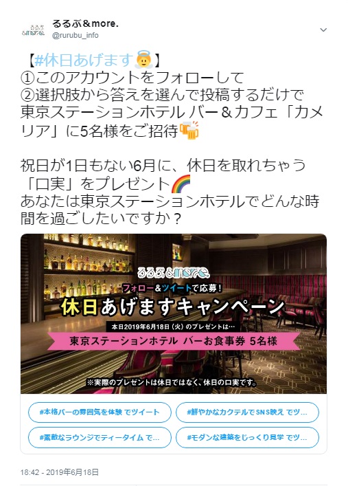 6月18日(火)のプレゼントは、東京ステーションホテル内「カフェ&バー カメリア」のお食事券 5名様分!「るるぶ&more.」公式Twitterアカウント をフォローして、下記のツイートからアンケートに回答ツイートでご応募ください。