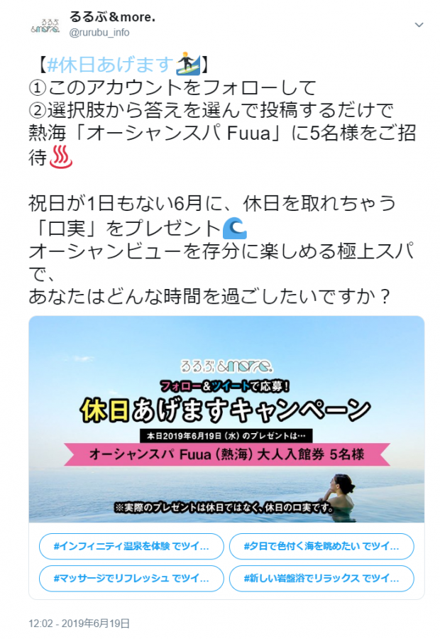 6月19日(水)のプレゼントは、オーシャンスパfuua入館券 5名様分!「るるぶ&more.」公式Twitterアカウント をフォローして、下記のツイートからアンケートに回答ツイートでご応募ください。