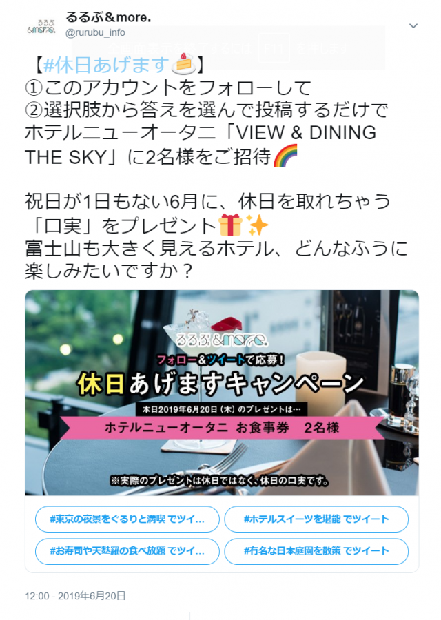 6月20日(木)のプレゼントは、ホテルニューオータニお食事券 2名様分!「るるぶ&more.」公式Twitterアカウント をフォローして、下記のツイートからアンケートに回答ツイートでご応募ください。