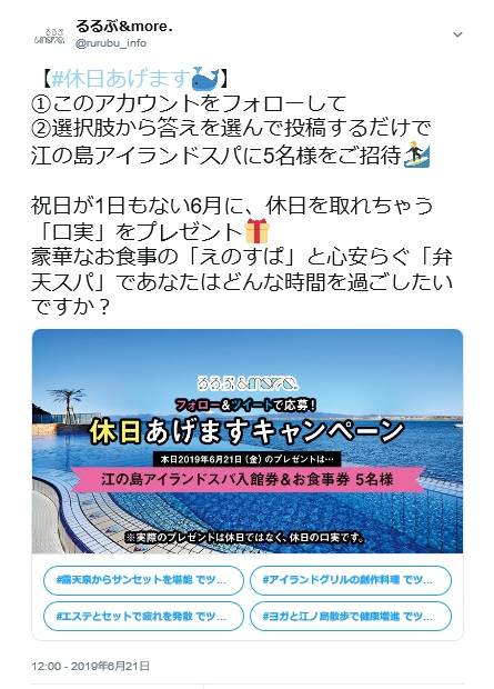 6月21日(金)のプレゼントは、江の島アイランドスパ入館券+お食事券 5名様分!「るるぶ&more.」公式Twitterアカウント をフォローして、下記のツイートからアンケートに回答ツイートでご応募ください。