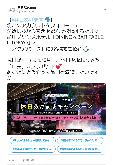 6月22日(土)のプレゼントは、品川プリンスホテルお食事券+マクセル アクアパーク品川入場券 3名様分!「るるぶ&more.」公式Twitterアカウント をフォローして、下記のツイートからアンケートに回答ツイートでご応募ください。