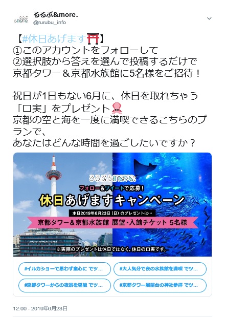6月23日(日)のプレゼントは、京都タワー+京都水族館セット入場券 5名様分!「るるぶ&more.」公式Twitterアカウント をフォローして、下記のツイートからアンケートに回答ツイートでご応募ください。