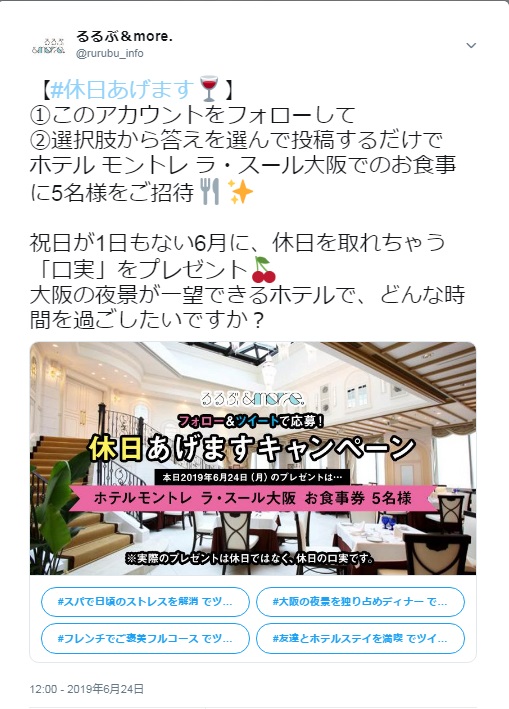 6月24日(月)のプレゼントは、ホテルモントレ ラ・スール大阪お食事券 5名様分!「るるぶ&more.」公式Twitterアカウント をフォローして、下記のツイートからアンケートに回答ツイートでご応募ください。