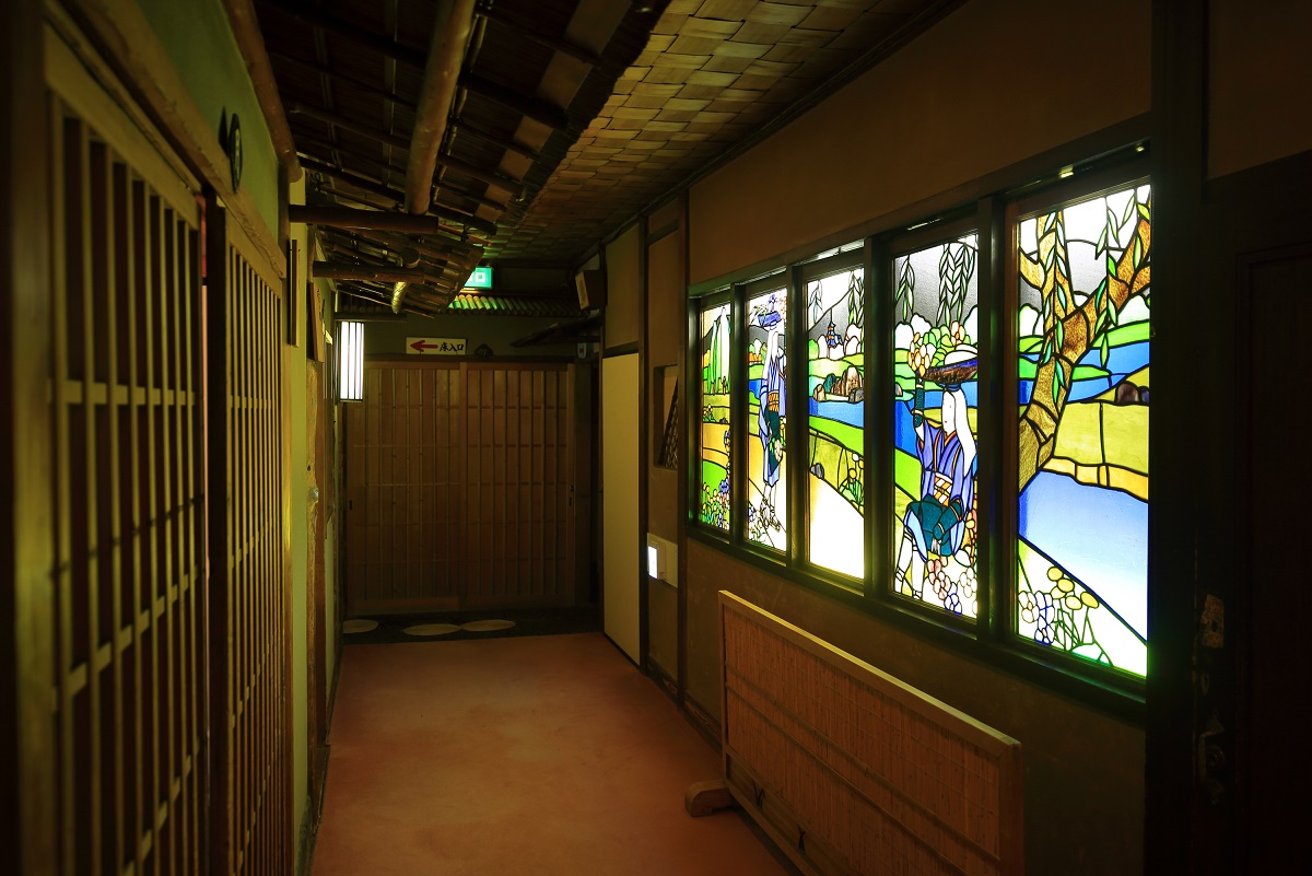 店内の雰囲気はまさに昭和レトロそのもの。建築当時の意匠がそこかしこに見られ、宮大工の技が見られる廊下を歩いていると、タイムスリップしたかのような気持ちになります。味わい深くノスタルジックなステンドグラスも素敵です。