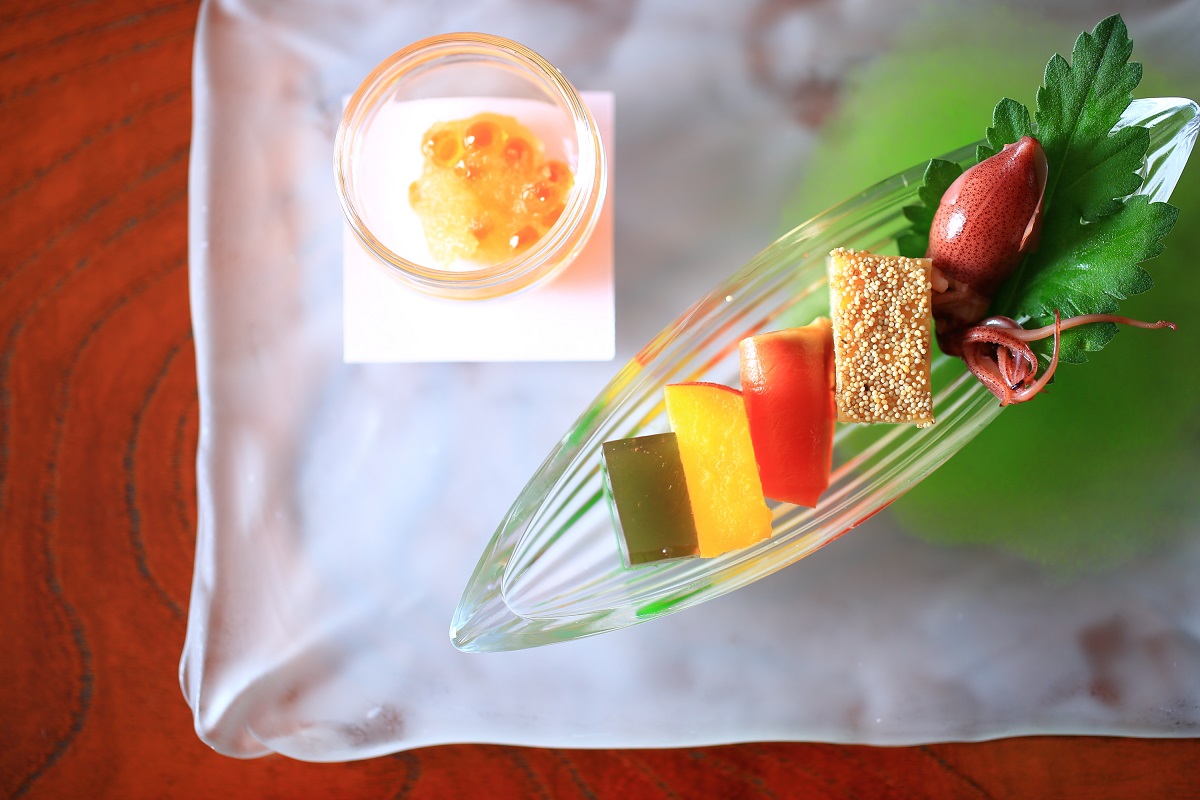 イクラのみぞれ和え、鯛の練り物、サツマイモのレモン煮、燻製サーモン、ホタルイカ、梅のゼリーが並ぶ八寸は、味も色も多彩でカラフル。