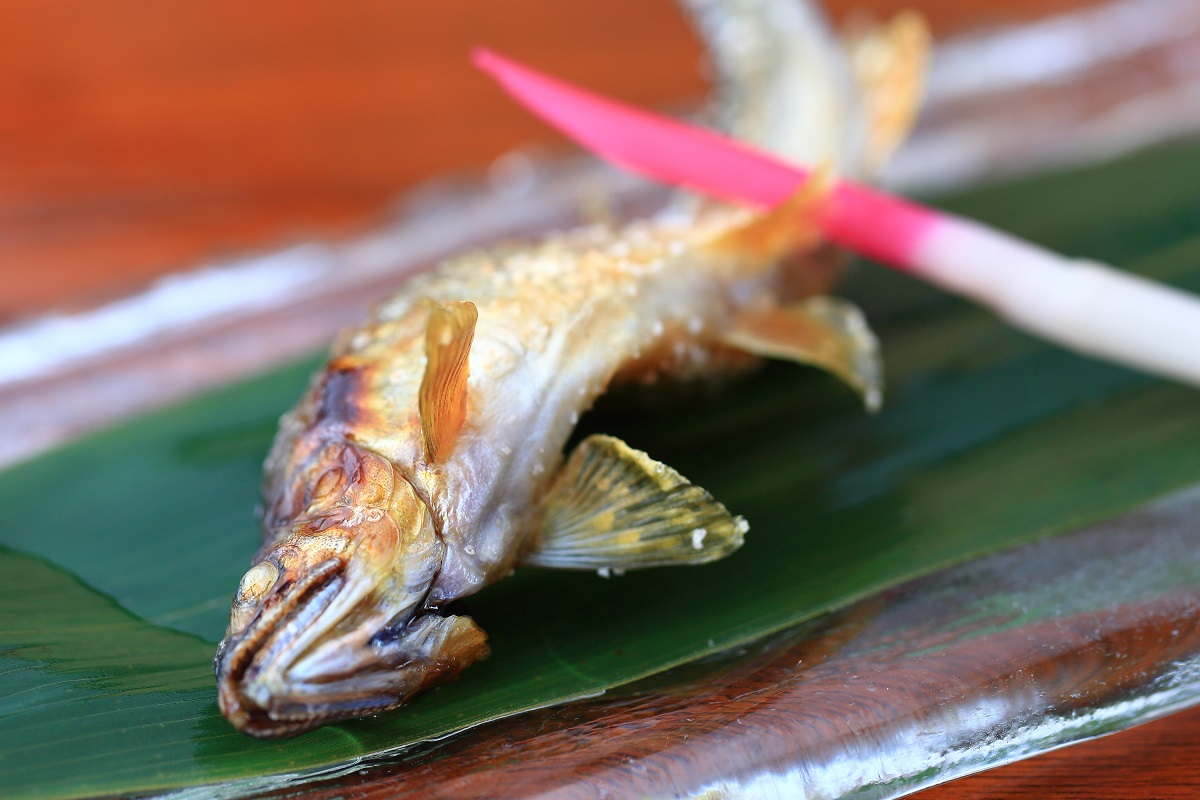 川床といえば、川魚の料理も欠かせません。定番の焼物といえば、こちらのアユの塩焼き。背中から豪快に身をほおばってください。