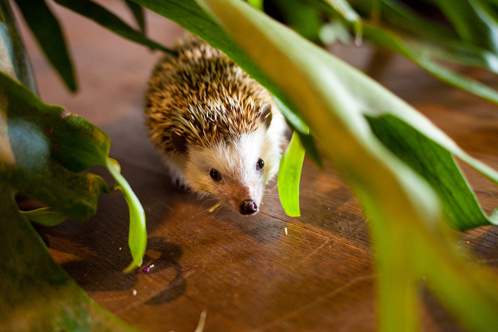 「秘密基地植物園とカフェバー」の隠れたアイドル、ハリネズミのパキポちゃん。夜行性のため、夜の店内を30分ほどおさんぽします。パキポちゃんは、公園に捨てられていたのを藤本さんが救ったそう。見かけたらそっと見守ってあげてくださいね。