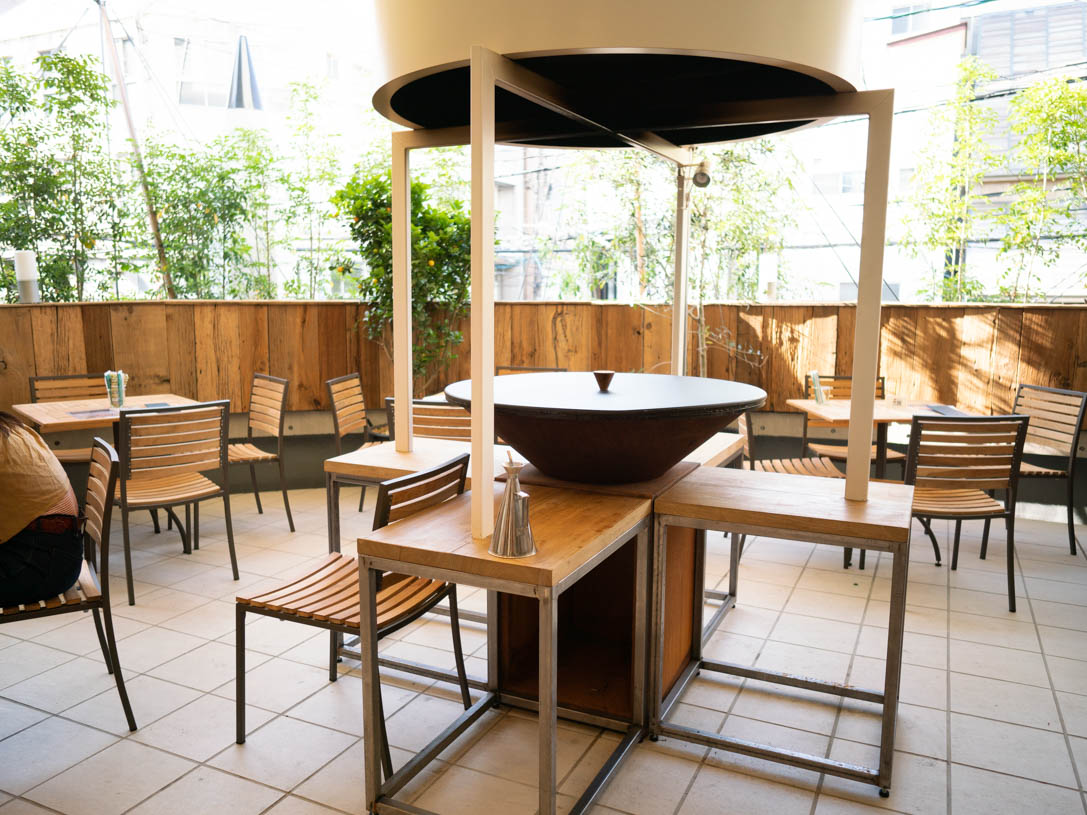 階段を上った先には、緑あふれる開放的なテラス席が。中央には大型のグリルが設置してあり、夜は火が入ってお肉や野菜を焼くことができます。屋根があり、雨の日でも安心してくつろげるのが嬉しい。