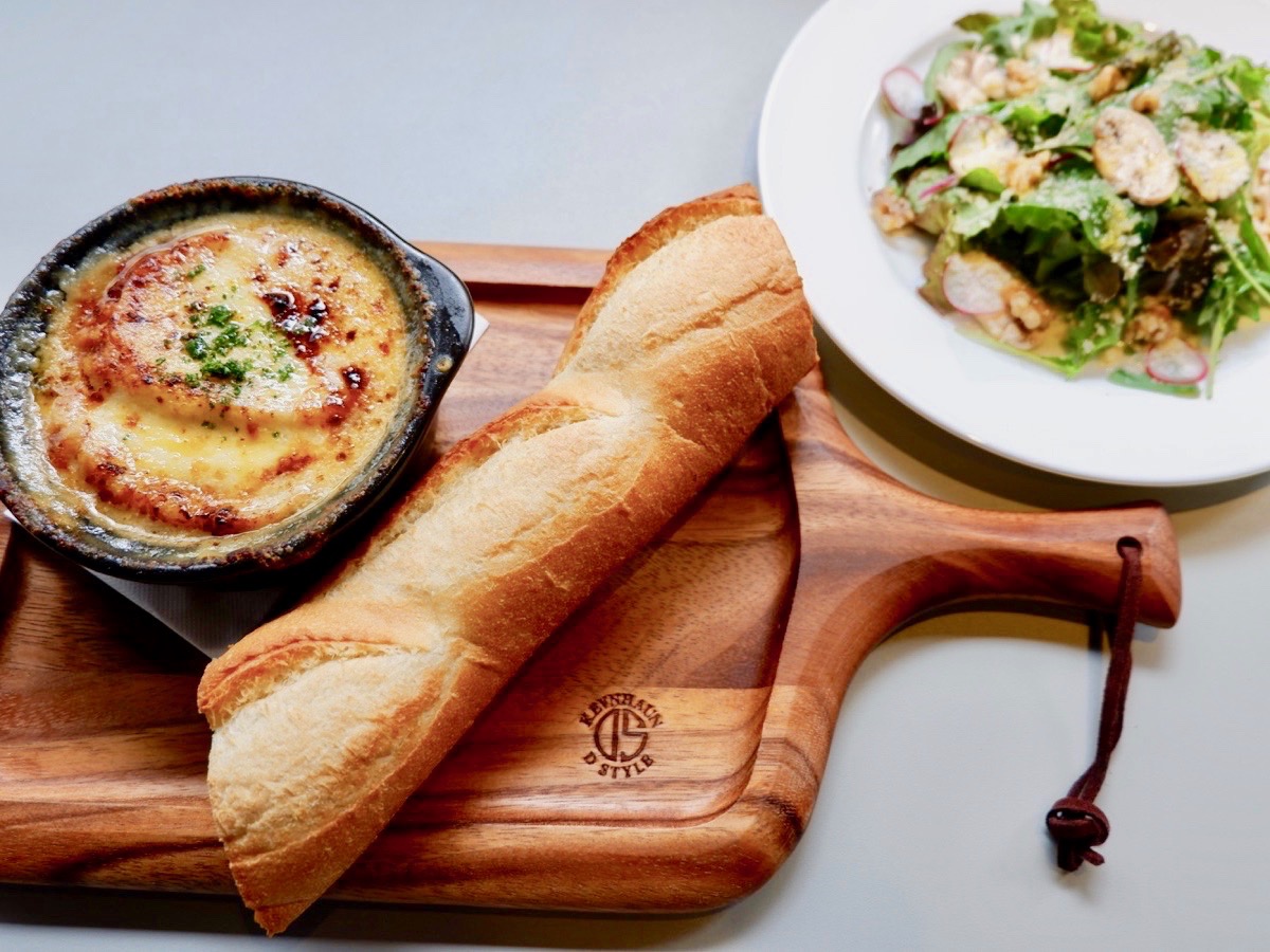 とろ〜りチーズと濃厚な味わいのオニオングラタンスープ、外がカリッと香ばしくなかはもっちりしたバゲットの組み合わせがたまりません!