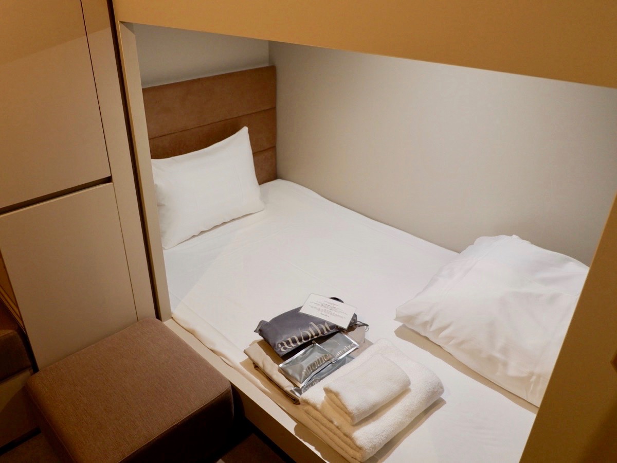 Mサイズ(約4.6平米/5900円〜)は上下2段タイプのキャビン。ベッドの横には小さなテーブルとソファー、ロッカーが設置されたスペースがあります。