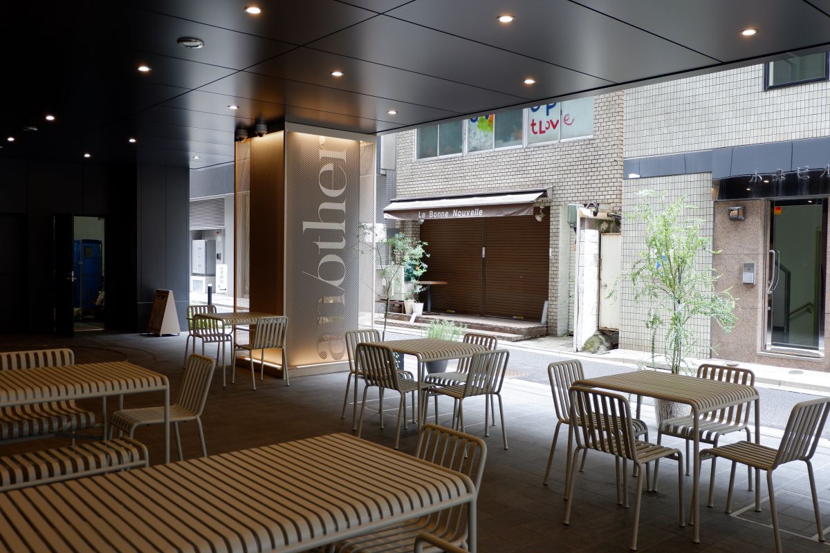東京メトロ銀座線・京橋駅から徒歩1分。中央通りから路地を入ったところに位置するスタイリッシュな外観の建物が「an/other TOKYO(アナザートウキョー)」です。ホテルのロゴを配した柱と緑あふれる開放的なテラス席が目印。