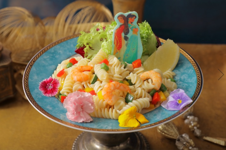 「ジャスミンとダリア カラフルパスタ」1790円は、二人の友情をテーマにしたガーリック風味のオイルパスタ。エビとグリル野菜で演出したお皿がカラフルで気分を盛り上げてくれます。
