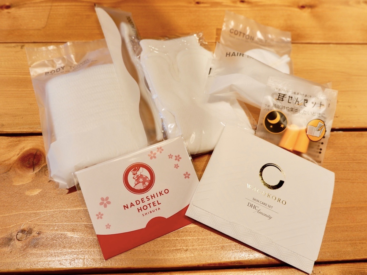 アメニティはDHCの基礎化粧品セット「WAGOKORO」をはじめ、あぶらとり紙、歯ブラシセット、ヘアブラシ、コットンセット、耳栓、足袋など、かなり充実しています。