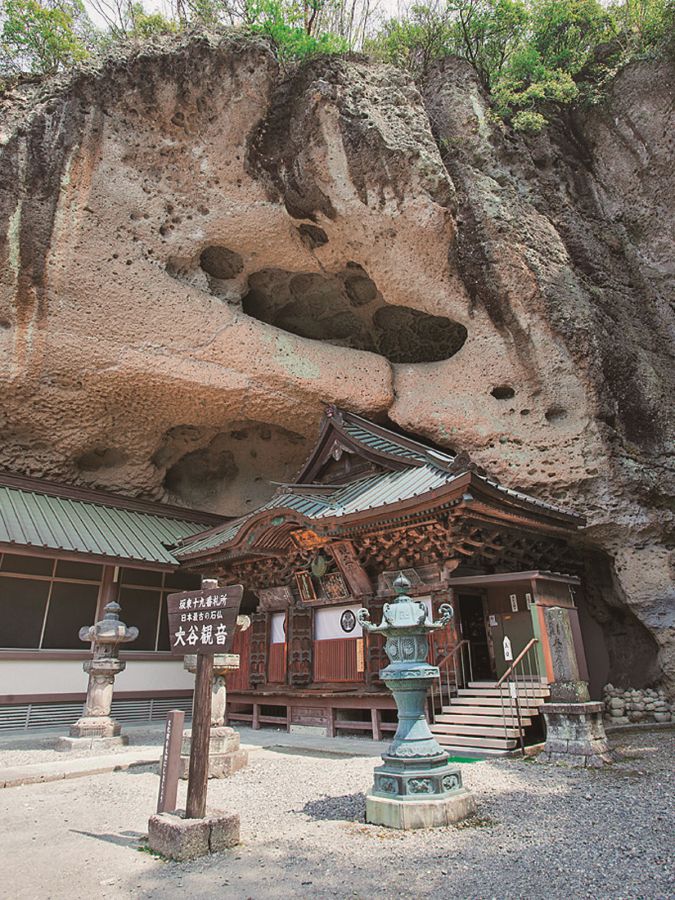 岩に覆われるように立ち、弘法大師が弘仁元年(810)に開いたと伝わっているこのお寺は、自然の岩壁に掘られた日本最古ともいわれる本尊の大谷観音を含め、10体の石仏が国の特別史跡と重要文化財に二重指定されています。