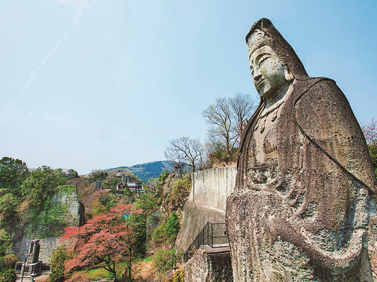 大谷石の壁に、頭頂部から爪先まで総手彫りによって造られた巨大な観音像。