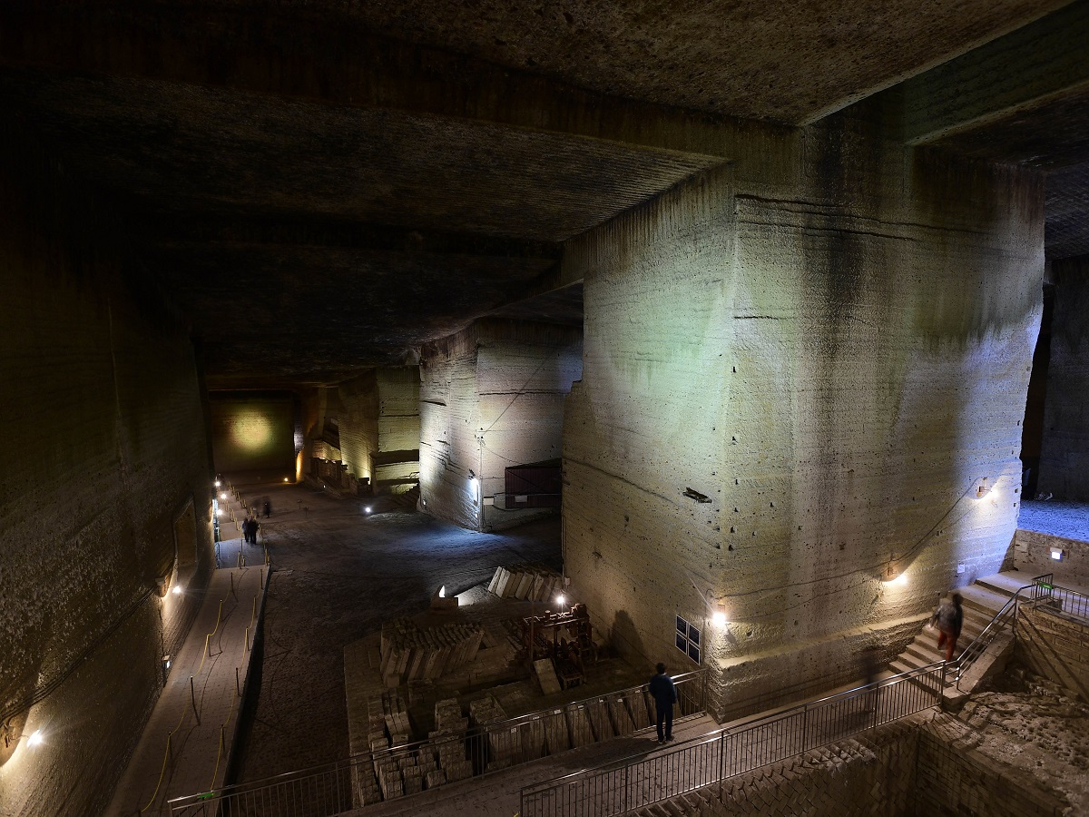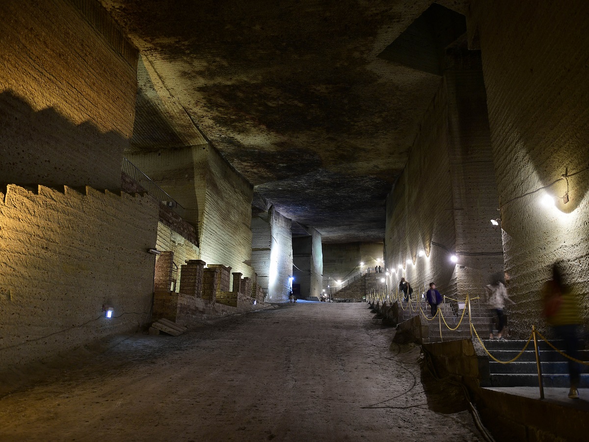 入口から続く階段を下りると現れる、広さ2万㎡の採掘空間。立ち入り可能な最深部は地下約30mにも達するのだとか。ほのかなライティングがムーディーです。