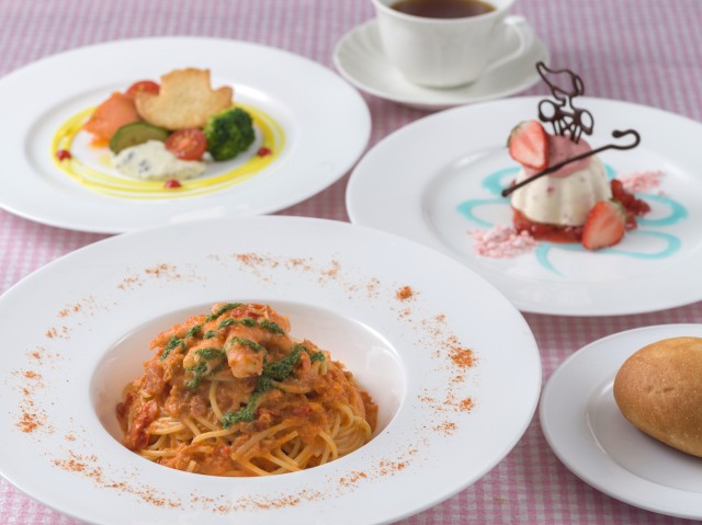 パーク内のレストランでは関連メニューも登場。東京ディズニーランドの「イーストサイド・カフェ」のシェフのおすすめセット2480円は、映画に出てくる“ボー・ピープ”をイメージしたデザート付きのスペシャルメニュー。カウボーイハット型のクルトンがのった前菜のほか、メインには海老とカニの濃厚なソースにケイジャンスパイスが効いたパスタが並びます。