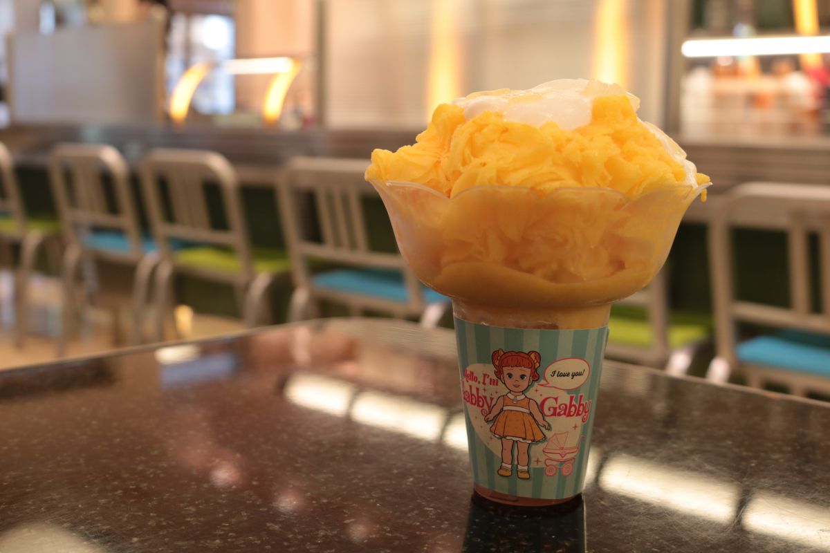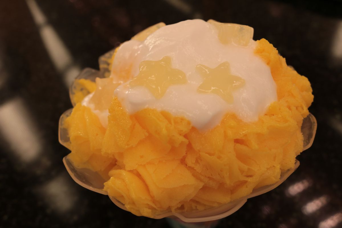 マンゴーソルベの下にはピーチゼリーが隠されていました。1つでいろんな食感が味わえるシェイブアイス。テイクアウトもOKです。提供時間は15~22時まで。パークをちょっと早めに出て味わってみませんか?