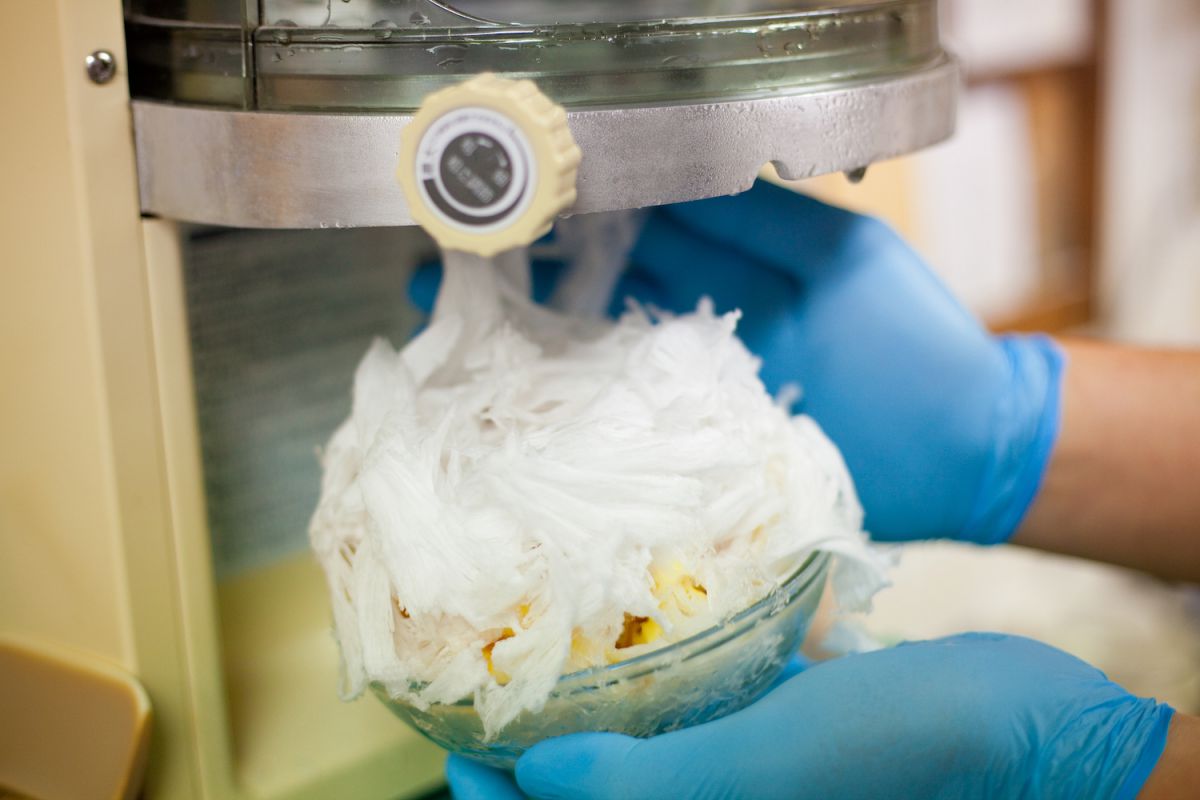 氷は極限まで薄く、濃厚なソースに合わせて大きくスライスするように削られます。