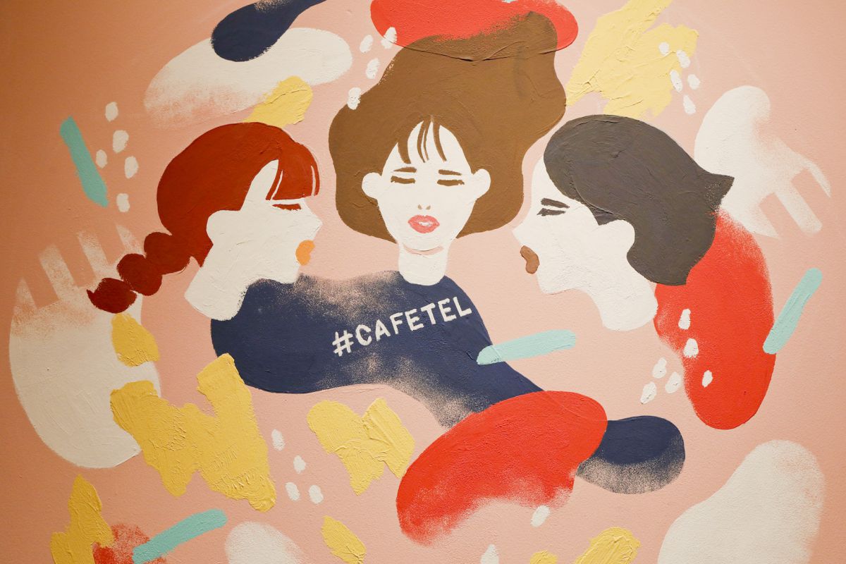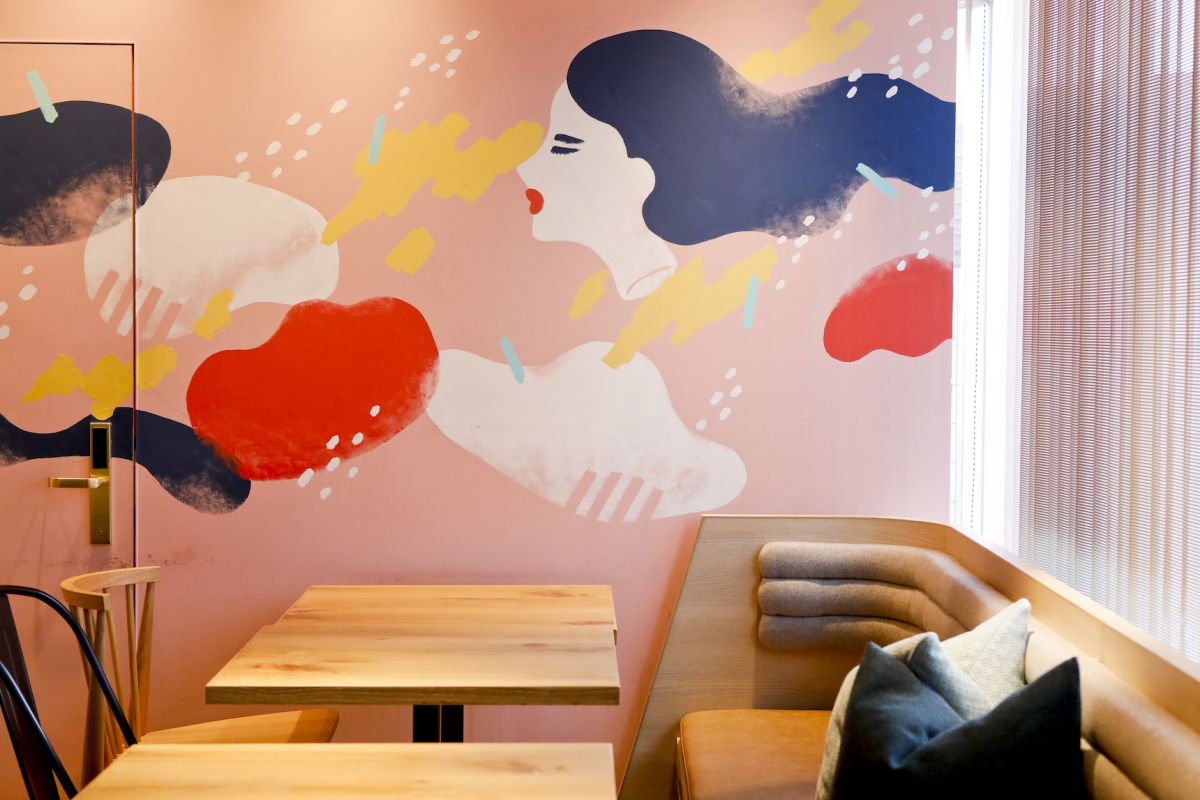 カフェの店内にはカラフルなアートが施され、フォトスポットが満載。柔らかなタッチや色使いに心が安らぎますね。