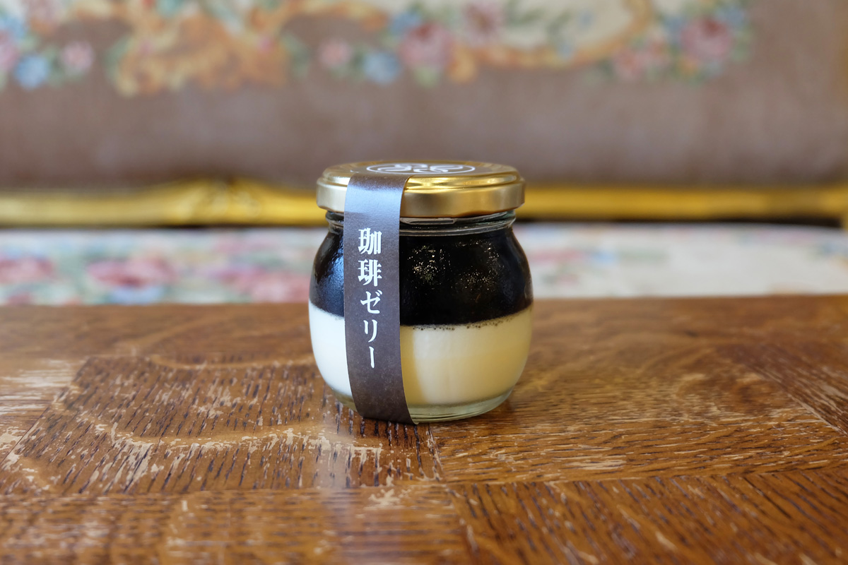 「珈琲ゼリー」(420円)は、常時登場するプリンのひとつ。山田珈琲のスペシャルティコーヒーを24時間かけて抽出し、バニラをブレンドしたジュレに仕上げた一品。コーヒーの苦味とプリンの甘みがマッチしたフレーバーです。