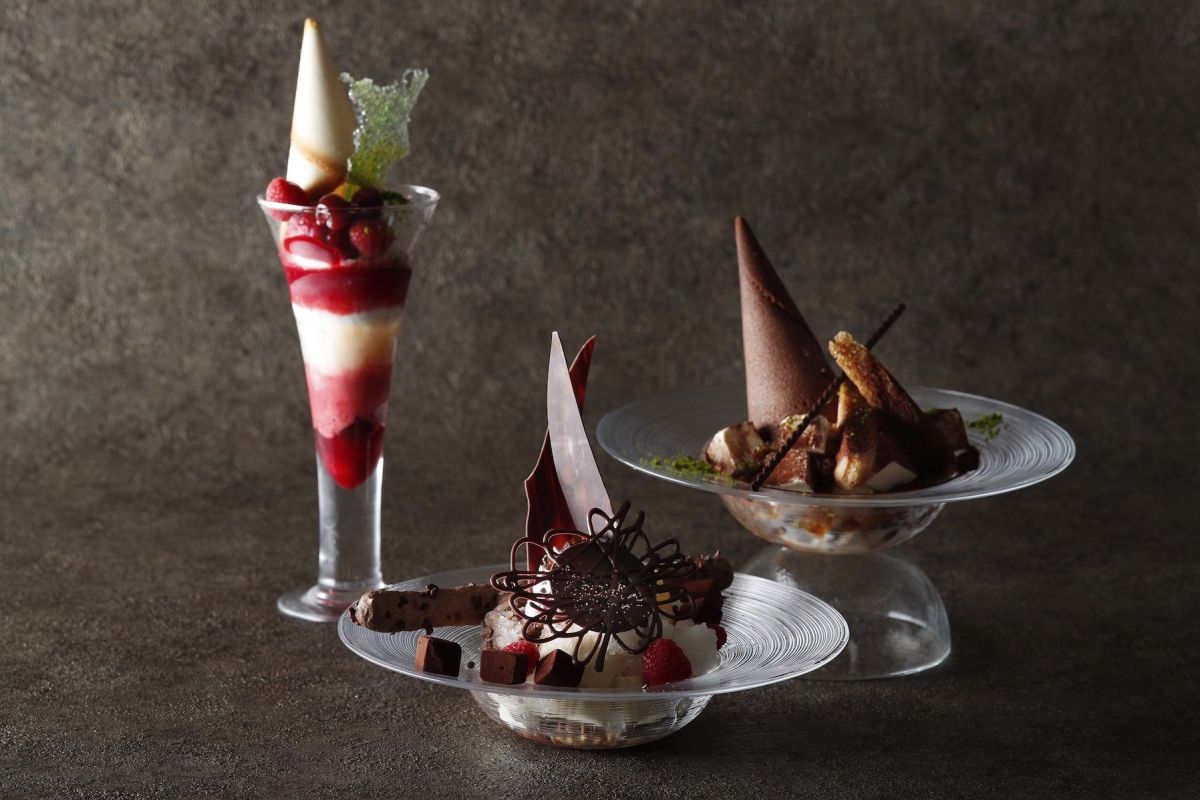 もう1種類は、17時から大人の雰囲気溢れる「トワイライトパフェ」各2200円。アシェットデセール(皿盛りデザート)スタイルで3品登場します。夜を迎えたムーディな空間で、「ラム酒香る大人のチョコレートパフェ」(手前)、コーヒーフレーバーの「ティラミスパフェ」(奥右)、ベリーが芳醇に香る「ヌガーグラッセとグリオットチェリーのパフェ」(奥左)と、見た目にも贅沢なパフェはいかがですか。
