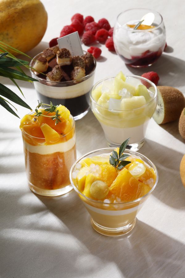 1階ペストリーブティック「ウェスティン デリ」では、旬のフルーツをふんだんに使った涼やかな新作グラススイーツを販売。「赤いベリーのヨーグルトクリーム」、「コーヒーゼリーとティラミス」、「メロンとココナッツのパンナコッタ」、「ババエキゾチック」、「マンゴープリン」(写真上から)各620円~と、夏の手土産にもピッタリの5品です。