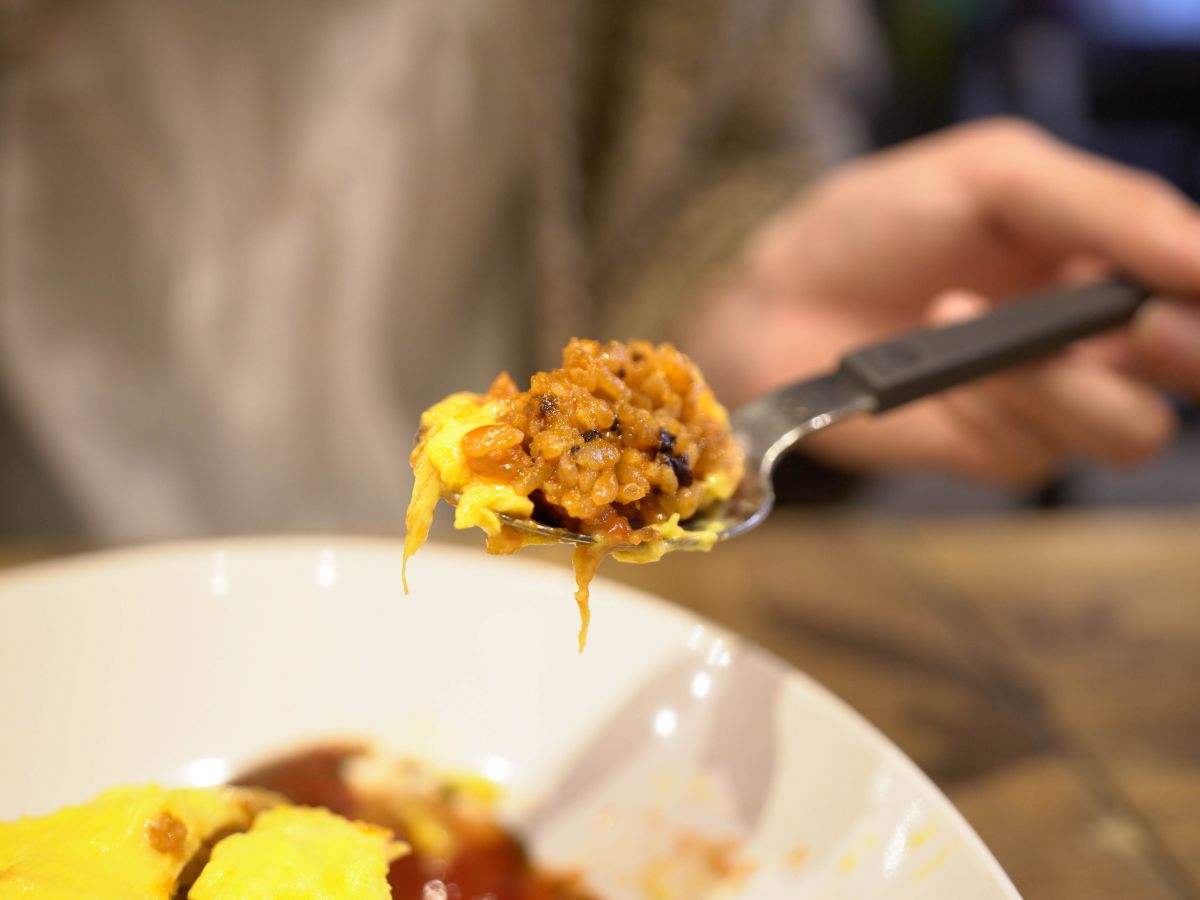 口に入れると、卵がふわっとろっと優しく広がります。ごはんにはお野菜と角切りのベーコンがごろっと入っていて、食べごたえ抜群!ケチャップの味付けもくどくなく、最後まで飽きずに食べきることができます。