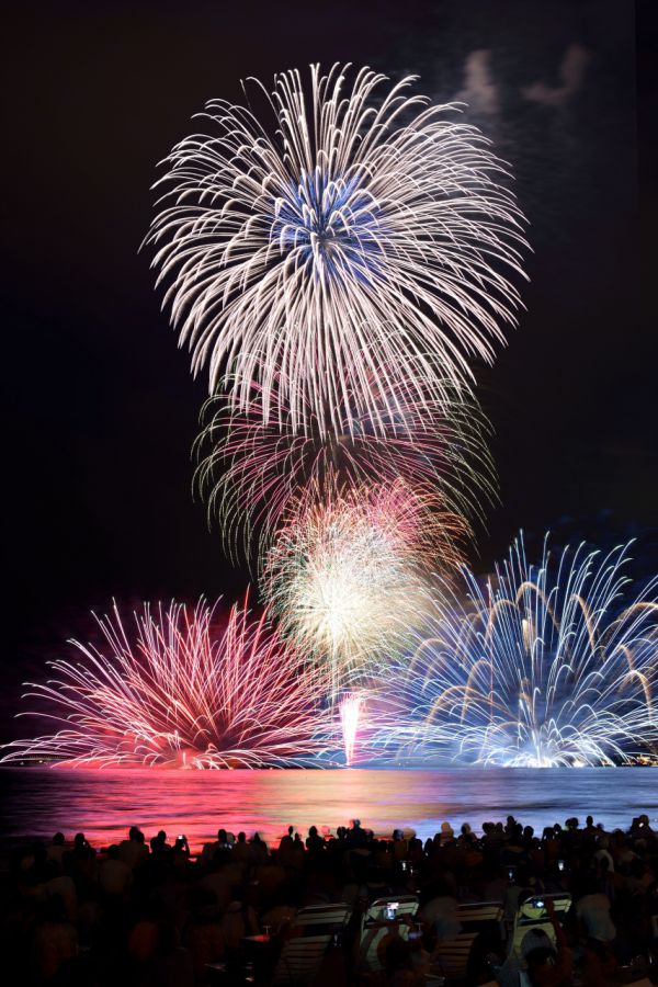 名物は、船から海へと投げ込まれ、海面で扇形に花開く「水中花火」。スターマインや大きな尺玉花火も海上から打ち上げられます。鎌倉の海が一面、花火の色に染まる様子は圧巻です。