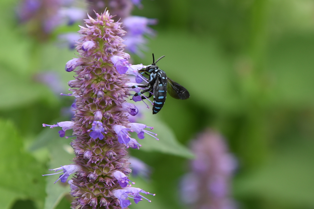 ダリアの開花と同時期にみられるのが、青と黒の体色が特徴の蜂「ブルービー」。