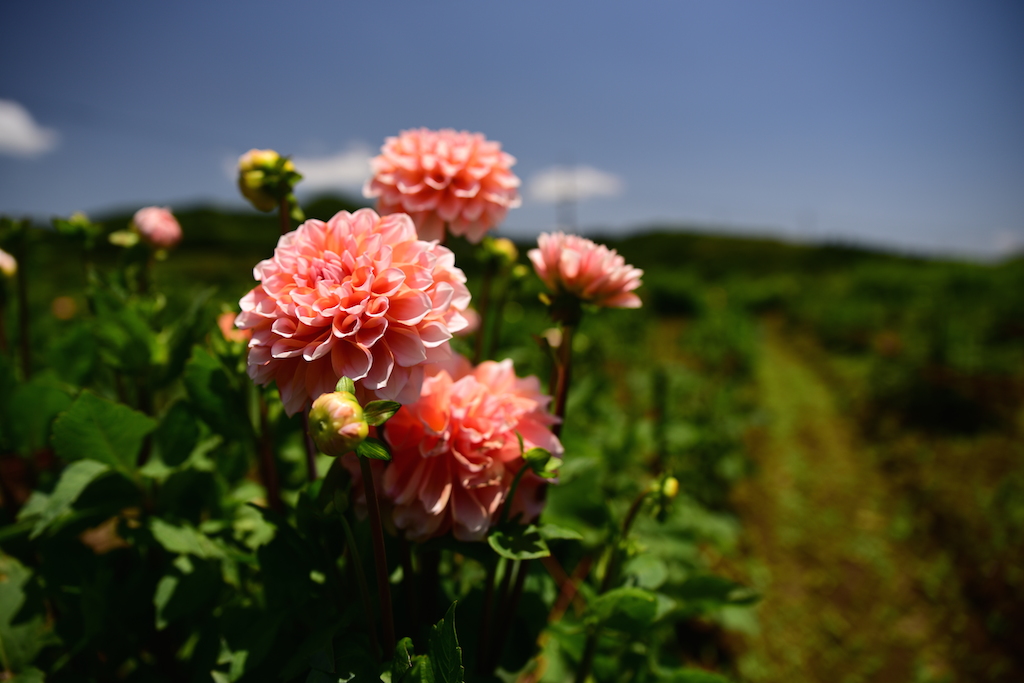 ダマスクローズの収穫の後、6月末頃から見ごろを迎えるのがダリア。約500種8000本がカラフルに大輪の花を咲かせます。夏の青空に映える鮮やかな色でいっぱいの花畑が楽しみ!
