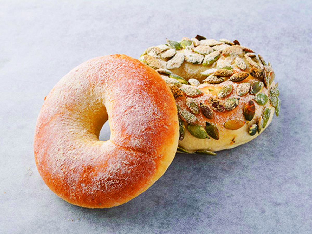 ベーグル1個151円~。噛むほどにおいしいベーグル。かぼちゃの種、あずききなこなど、種類も豊富に揃います。
