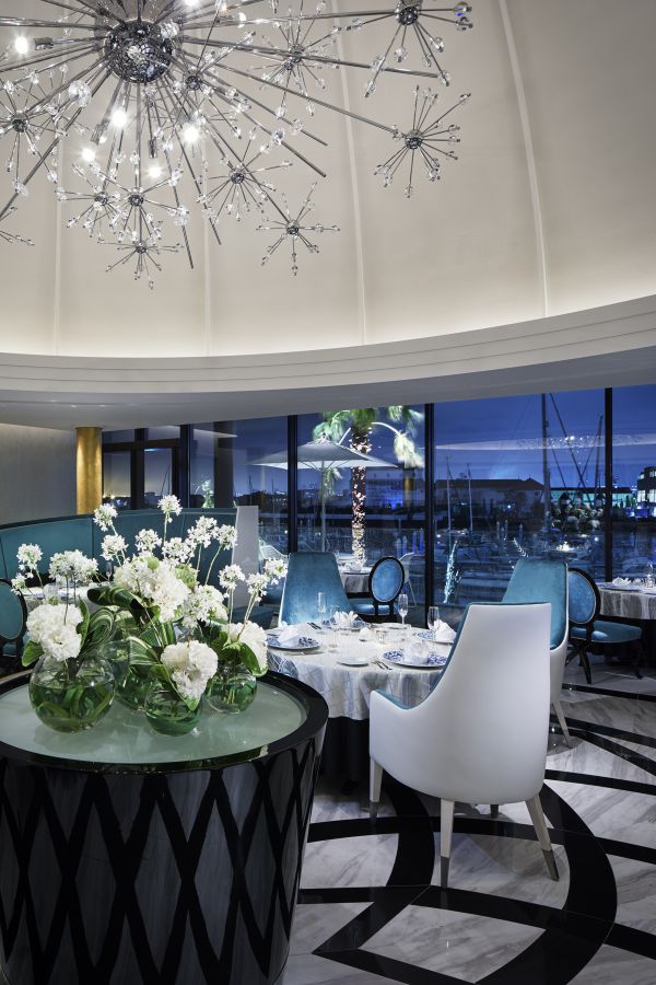 店内のしつらえも、マリーナと調和する白とターコイズブルーがベース。清潔感があふれるインテリアもゴージャスな雰囲気です。 窓が大きくとられ、どの席からも外の景色が楽しめます。