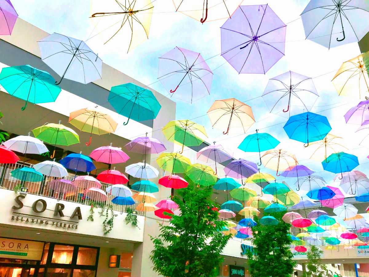 180本近くのパラソルが梅雨空を満開に彩る!「エイスクエア」