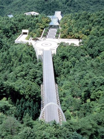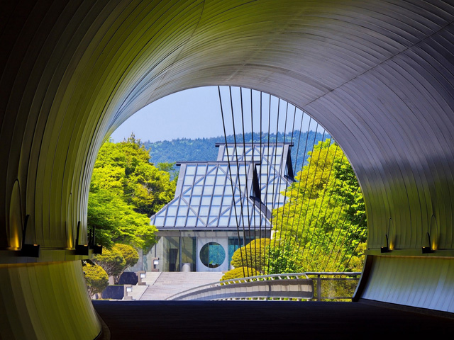 山間にポツンと佇むこのミュージアムは、多彩な日本美術とともに、エジプト・西アジア・ギリシャほか世界の古美術品を収蔵する美術館。見ごたえのあるコレクションはもちろんだが、そこにたどり着くまでの道のりが変わっていることが特徴です。レセプション棟と美術館棟が離れて建っているため、桜の並木道、銀色のトンネル、深い谷を渡る吊り橋というアプローチを通って行きます。美しい山並みを眺めながらの散策は、アート鑑賞に訪れたとは思えない爽快感。ルーヴル美術館のガラスのピラミッドで知られるI.Mペイ設計の美しい建物も要チェックです。