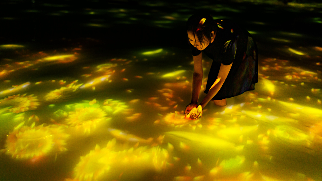 2019年7月7日(日)から7月21日(日)はヒマワリをモチーフにした作品が期間限定で登場。水面を泳ぐ鯉が人々にぶつかると、鯉たちが向日葵に変化し散っていきます。水の中を歩いてみたり、水をすくってみたり。。。思い思いに作品を楽しめます。
