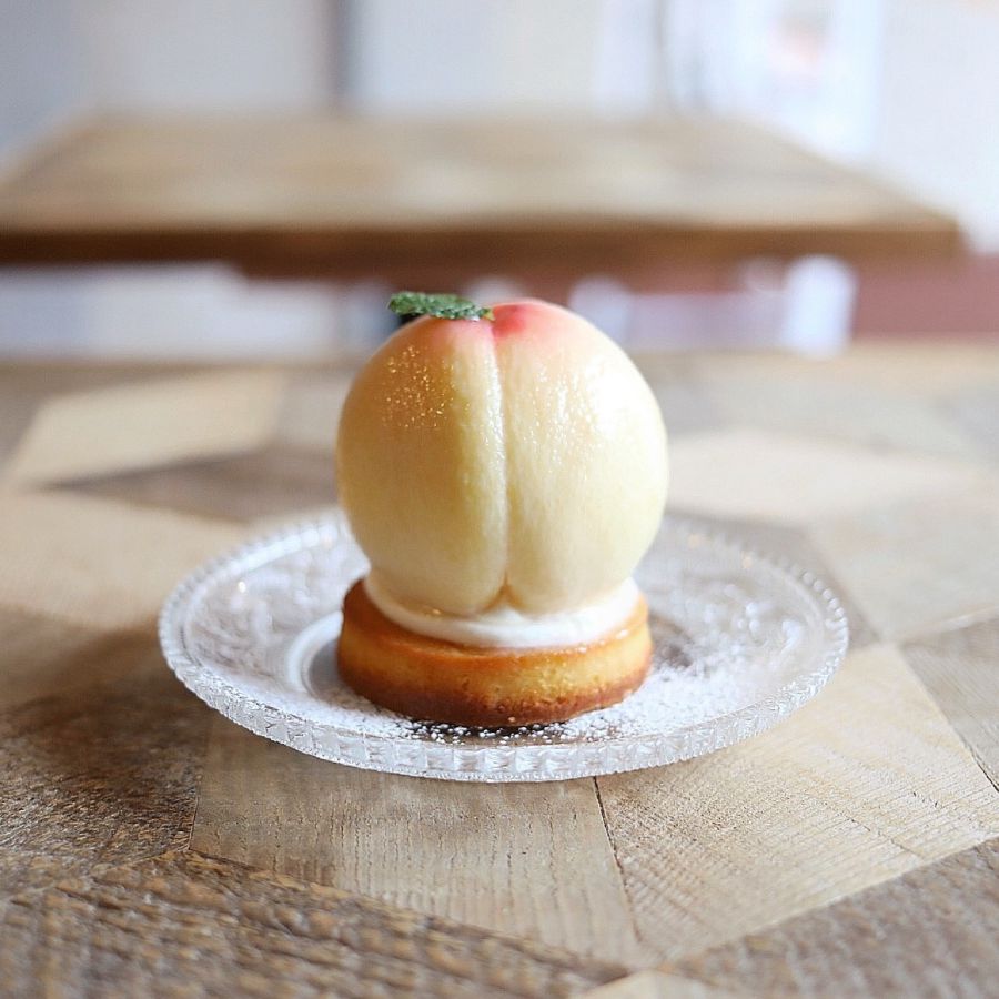 そぉっと桃を下向きにして種をくりぬき、濃いカスタードクリームを注入。やさしく扱わないとすぐに傷ついてしまう桃をまるごと使った、とても繊細なスイーツです。