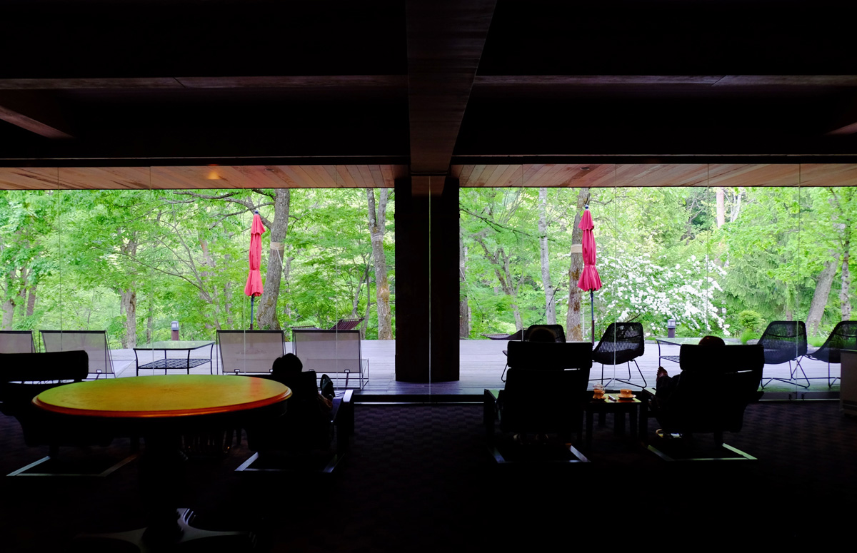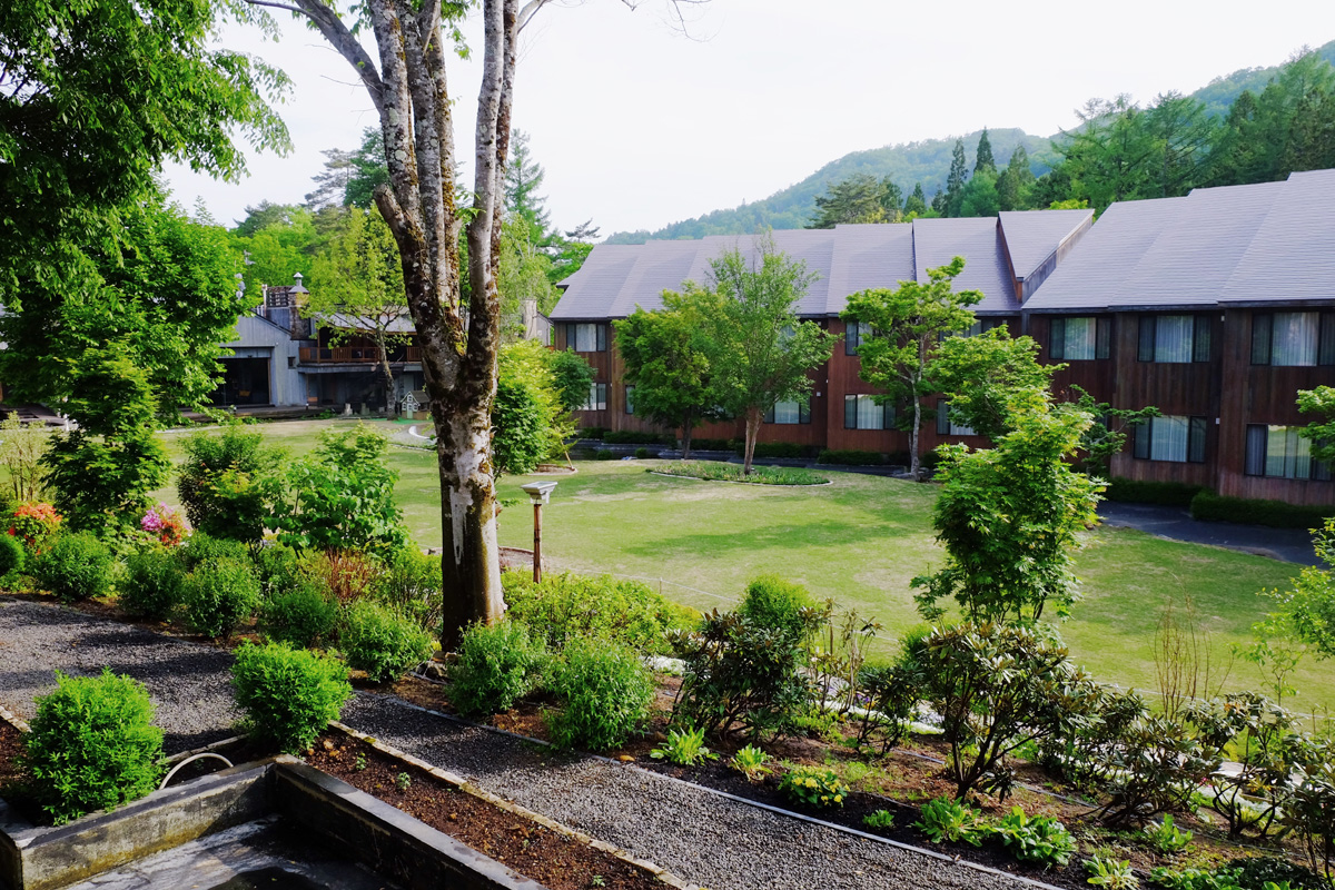 ロビーからの眺めです。ここでも新緑が眩しい。朝から庭師の方が手入れをしていました。