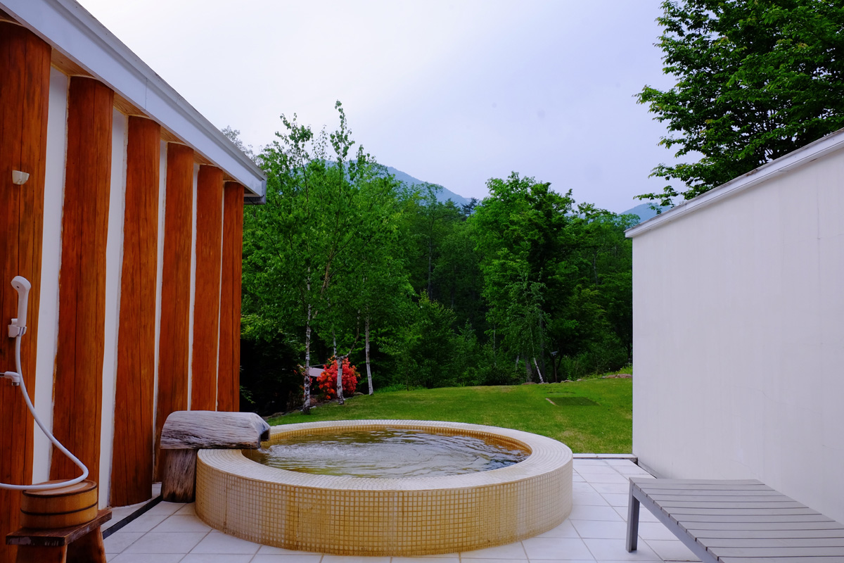 敷地内から湧き出る白馬みずばしょう温泉は、足湯のほか、貸切露天と大浴場で楽しむことができます。