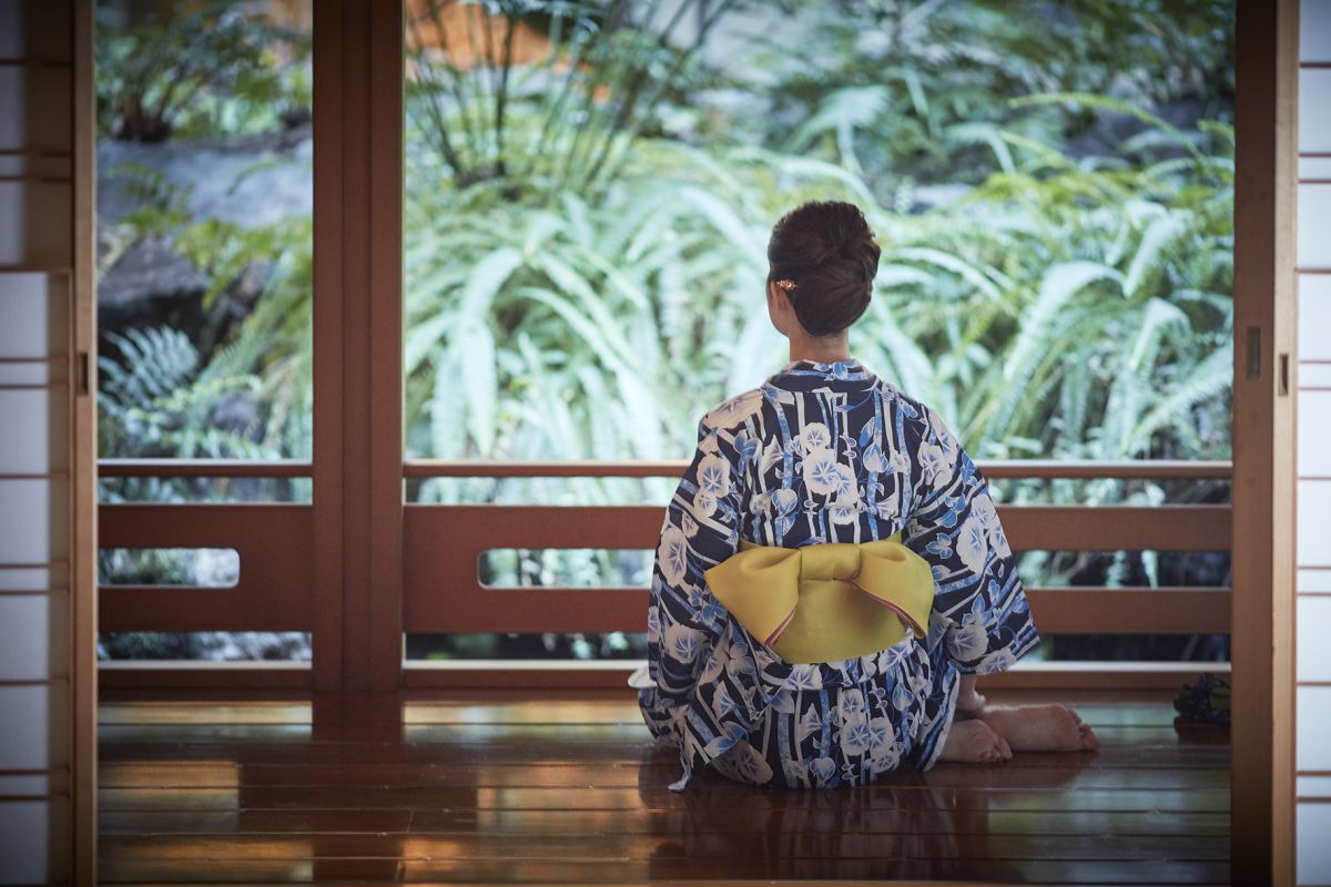 1つの部屋に複数の作品で空間を演出するコラボレーションもみどころの一つ。なかでも「草丘」のアートは浴衣姿で写真を撮りたくなる「映える」スポット。