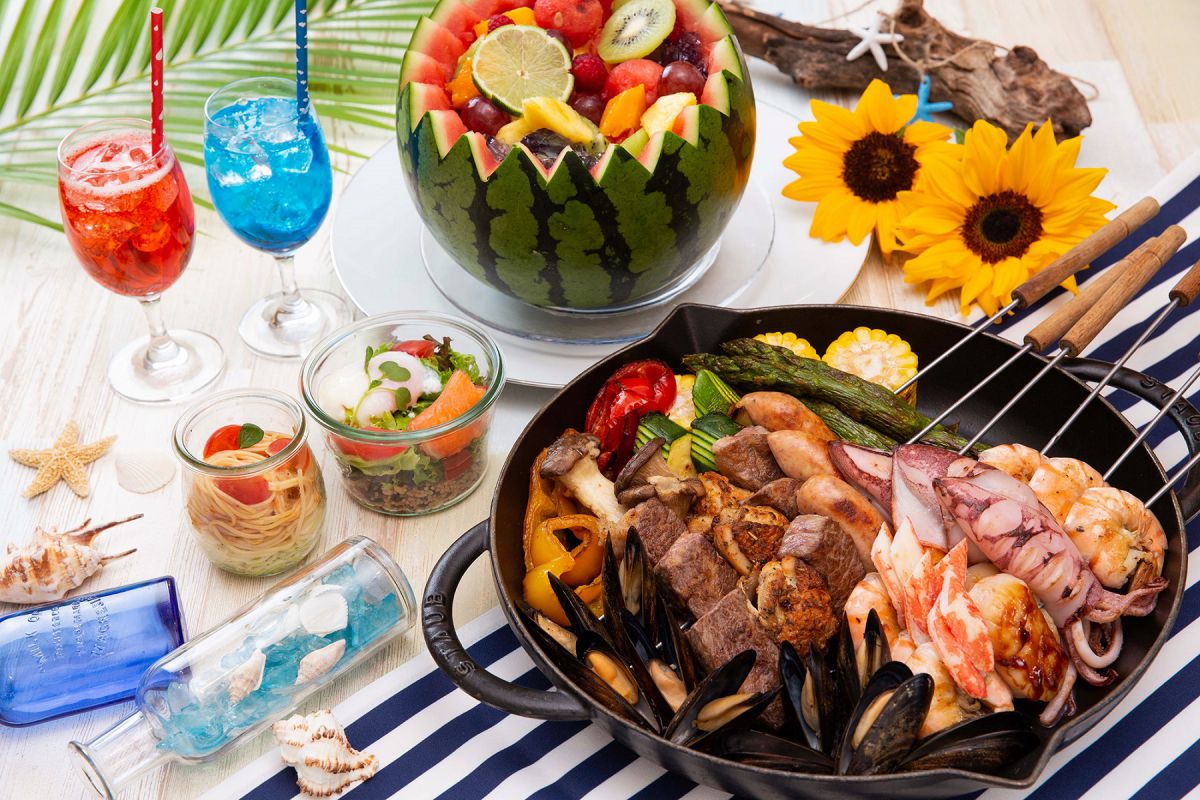 海といえばやっぱりシーフード!BBQのメニューは、ボリュームたっぷりのお肉や夏野菜、シーフードサラダ、カラフルなカッペリーニなど、フォトシューティングも楽しめるプランです。