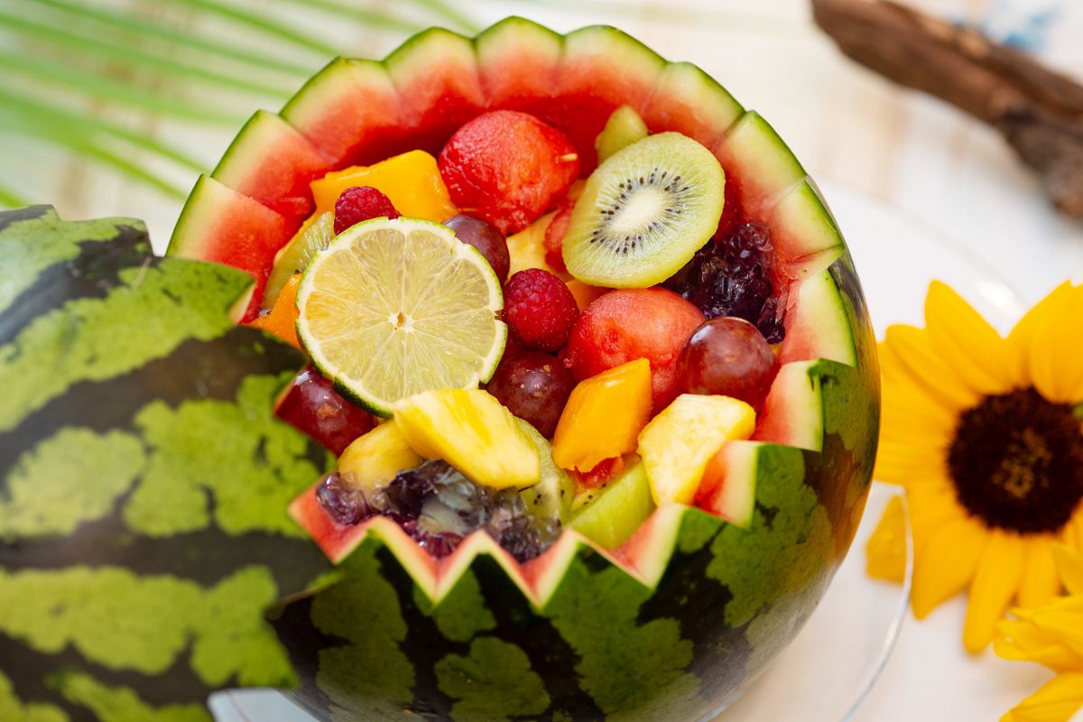デザートは、まるごとスイカを使ったビックサイズのフルーツたっぷり「スイカ割りポンチ」が登場!子供の頃のすいか割りを思いださせます。