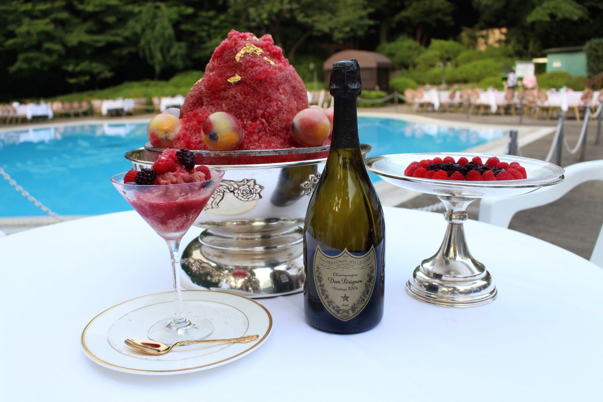 スペシャルメニューとして登場するのが、ドン ペリニヨン(750ml)1本分を贅沢に使った「ドン ペリニヨン かき氷」3万円。価格にはびっくりするけれど、味は抜群!硬度7の超軟水の天然水「南魚沼のおいしい湧き水」とラズベリーのピューレを混ぜて凍らせた氷を削った高さ約30cmの高級かき氷です。