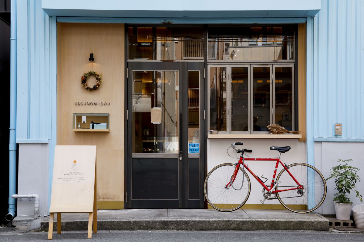 大阪市西区の新町にある「KAGUNOMI-DOU」は、ひと口サイズのスイーツを提供するパティスリー。きれいな水色の壁がひと際目を引きます。